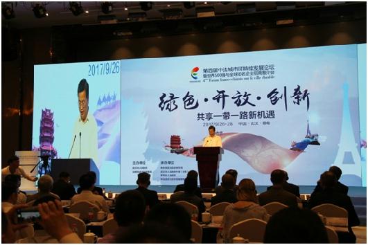 陈一新书记表示欢迎中建方圆投资发展有限公司参与中法新城及武汉市长江新城的投资建设。9点,第四届中法城市可持续发展论坛正式开幕,武汉市副市长徐洪兰主持,国家住建部、商务部有关司局领导、法国驻华大事馆经济事务公使衔参赞柏尤力、法国驻武汉领事馆总领事贵永华出席会议,陶盛发董事长在前排就座。陈一新书记出席开幕式并做主旨演讲,他首先简要介绍了武汉基本概况、奋斗目标和发展模式,指出武汉发展正站在新的历史起点上,当下投资武汉正当其时、大有可为,并着重推介了中法武汉生态示范城,他指出,中法武汉生态示范城是武汉市践行“一带一路”和长江经济带战略的重大合作项目、中法首个生态合作项目、湖北重要开放高地,是展示中法友谊与合作的窗口,中法武汉生态示范城将着力打造国际交往、产业创新、文化交流、低碳示范、生态宜居五大平台,当前,生态示范城总体规划已经获批,标志着生态城建设进入新阶段,市、区政府将以最优惠的政策、最好的投资环境、最佳的服务,助力各方投资者和建设者成就梦想。本届论坛还举行了世界500强对话中法生态城、信息安全与人工智能、设计与创新等主题研讨活动。